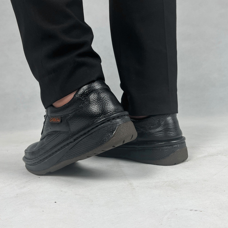 کفش طبی چرم مردانه مدل کلارک بندی رنگ مشکی، با طراحی کلاسیک و کفی نرم، مناسب استفاده رسمی و روزمره، ساخته‌شده از چرم طبیعی بادوام